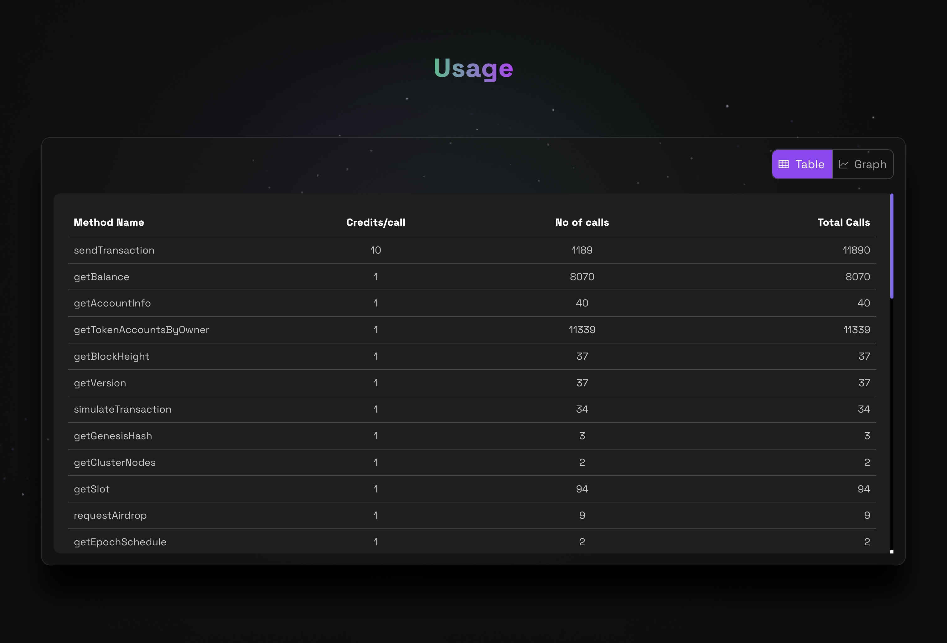 - Track every Solana method you’ve used, total requests made, and overall credit consumption.